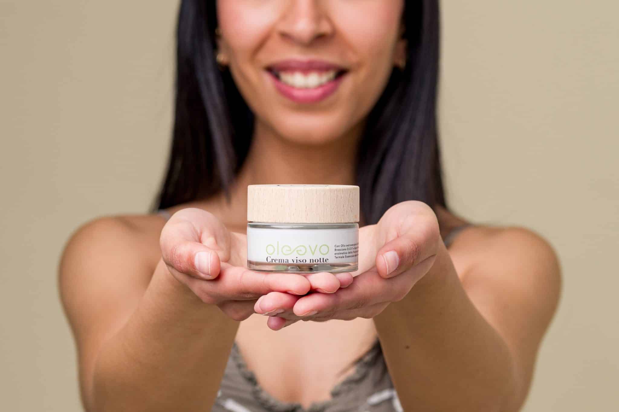 Il grande protagonista è l‘Olio extravergine di Oliva D.O.P. del lago di Garda, che, unito alla bava di lumaca della Franciacorta, all’acqua termale delle Terme di Boario e ad altri ingredienti naturali dà vita ai prodotti Oleevo.